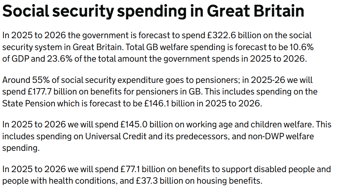 (£322bn/1370bn) = 23.5% of all Government spending is on Welfare payments.