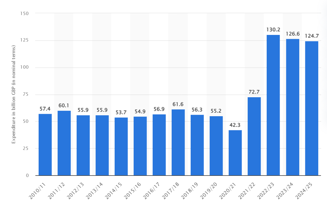 As you can see above, in 2024/25, total interest payments on HM Government debt was £124.7 Billion, money that is paid to the creditors of the UK (the lenders), which means, money that can NOT be used on the UK, e.g. not able to use £124.7 Billion on new hospitals or new schools or better roads. Servicing the debt is now a large part of HM Government expenditure.