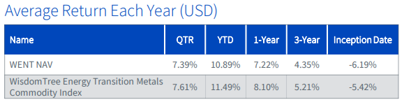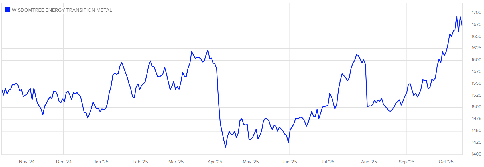 WisdomTree Energy Transition Metals is a fully collateralised, UCITS eligible Exchange-Traded Commodity (ETC) designed to provide investors with a total return exposure to a basket of Thematic Metals Baskets futures contracts. The Index is designed to track the performance of a diversified basket of metal commodities that are associated with the energy transition theme, which include, but are not limited to Electric Vehicles, Transmission, Charging, Energy Storage, Solar, Wind, and Hydrogen production.