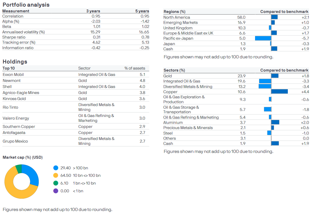 The JPM Natural Resources Fund aims to provide capital growth over the long-term (5-10 years) by investing at least 80% of the Fund’s assets in the shares of companies throughout the world engaged in the production and marketing of commodities.